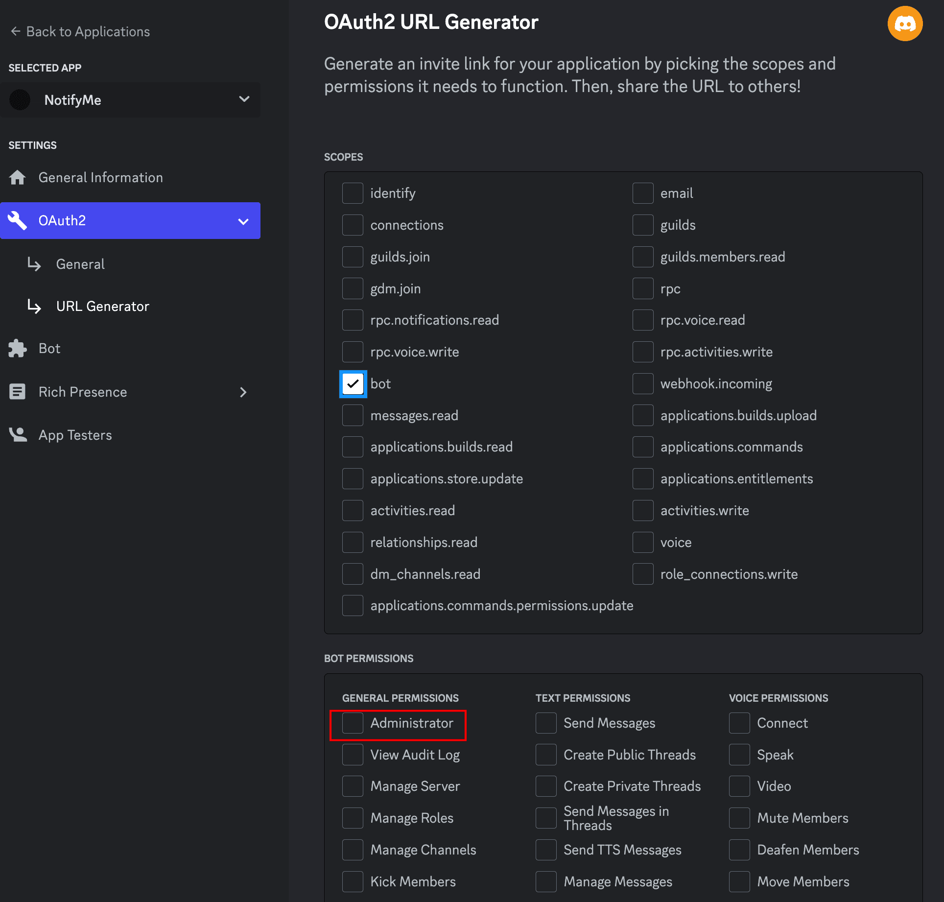 - Go to OAuth2 tab and select the bot scope. Select required permissions (choose administrator to get all permission). Copy the link and open it in a new tab. Select the server you want to add the bot to and click Authorize.