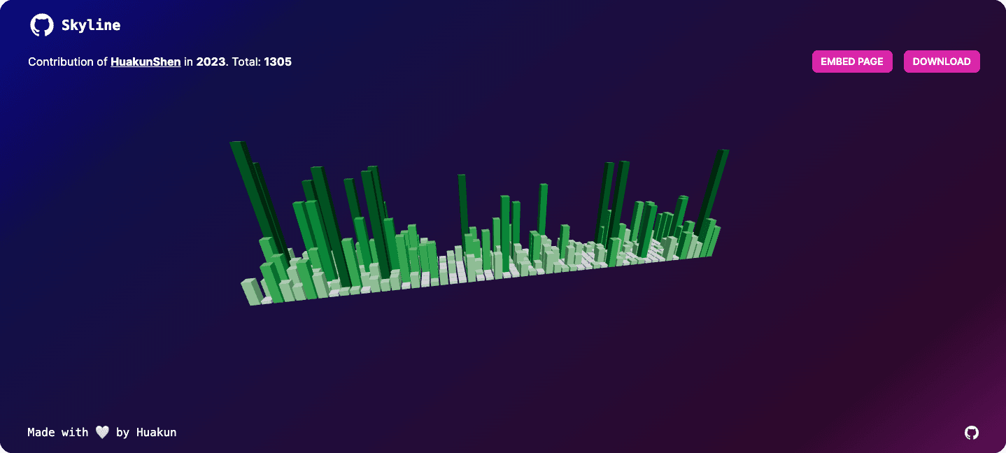 https://skyline.github.com/ is a cool feature of GitHub that shows your contribution graph in 3D but it stops working, and I decided to built my own version of it.